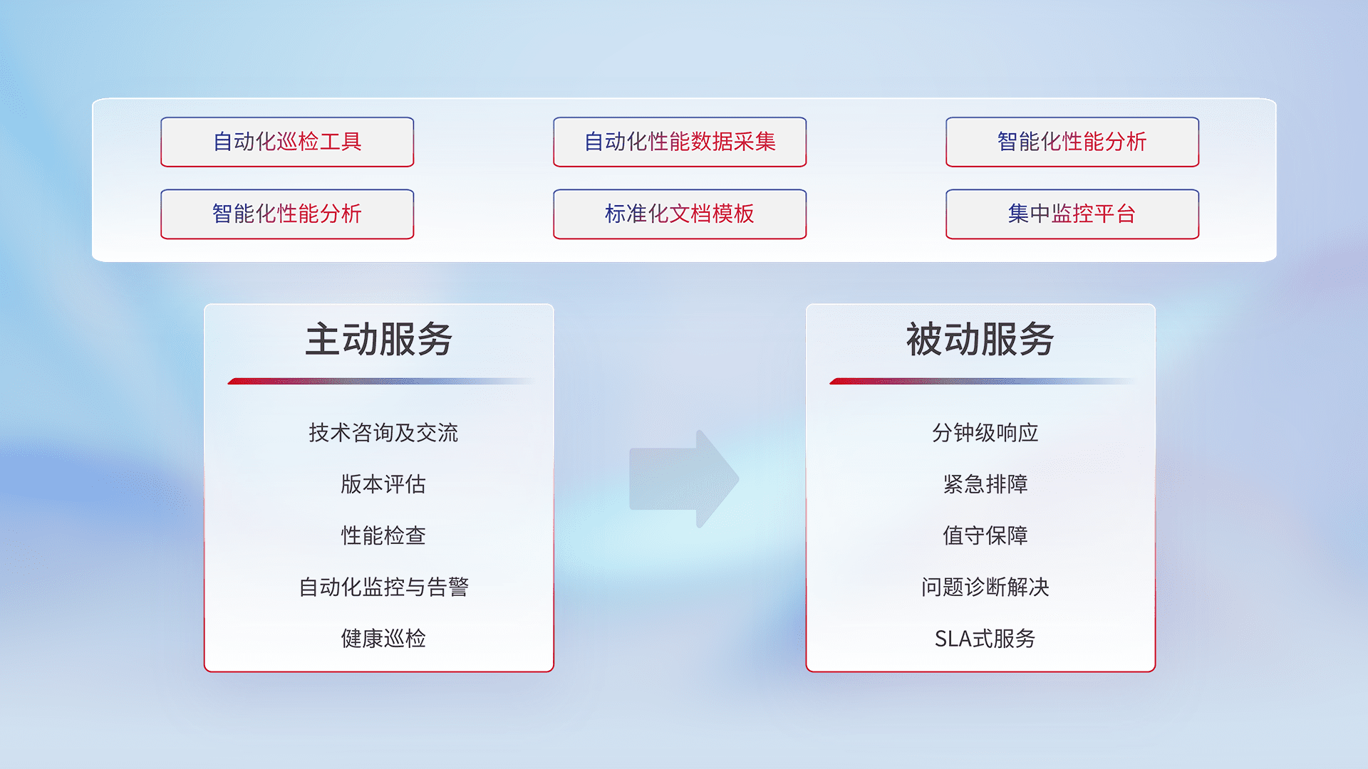 智能化工具和标准化文档,,保障服务质量,,,,提供主动服务(包含技术咨询、、、版本评估、、性能检查、、自动化监控与告警、、健康巡检)和被动服务包含(分钟级响应、、、紧急排障、、、值守保障、、、、问题诊断解决、、SLA服务)。。